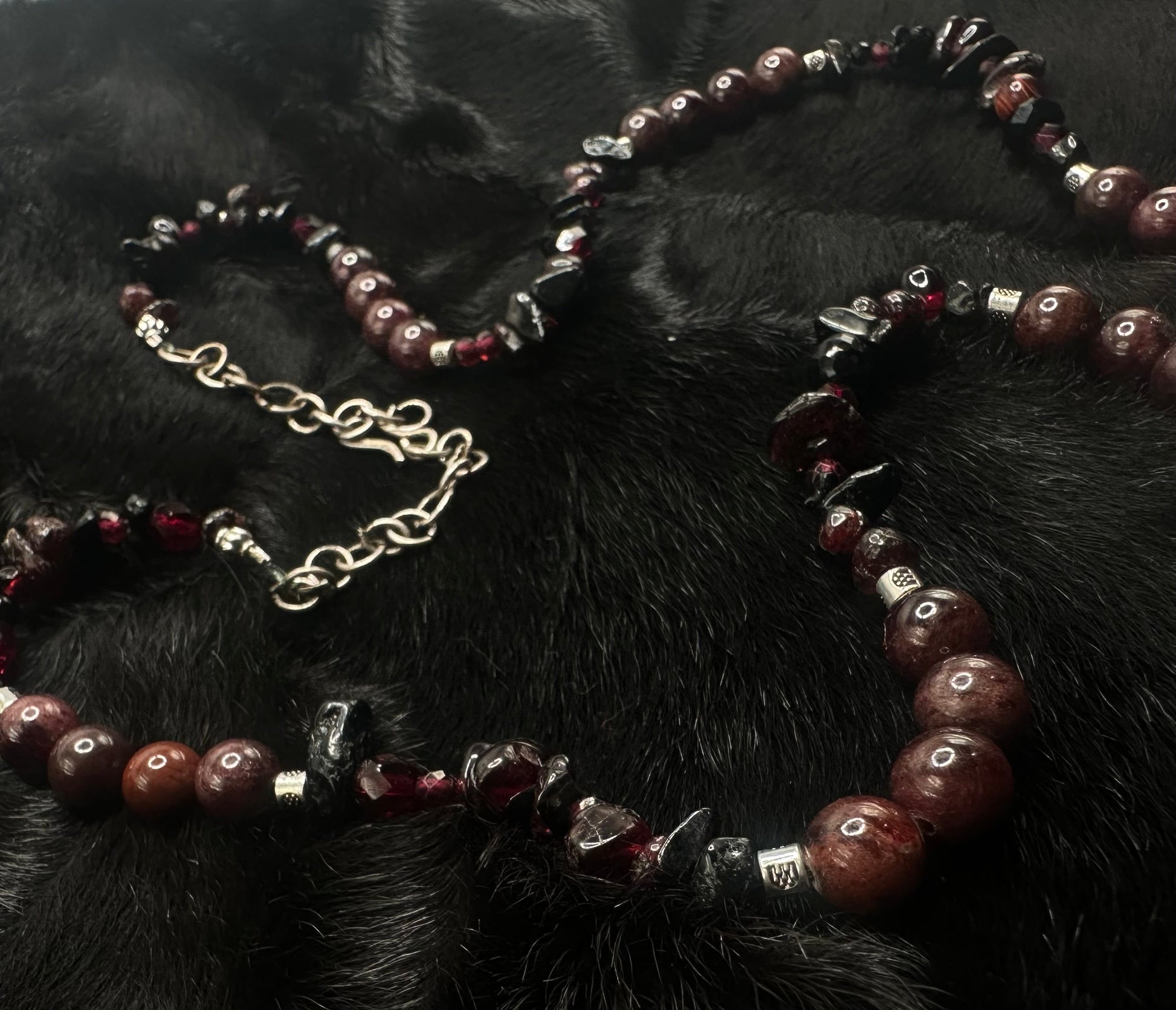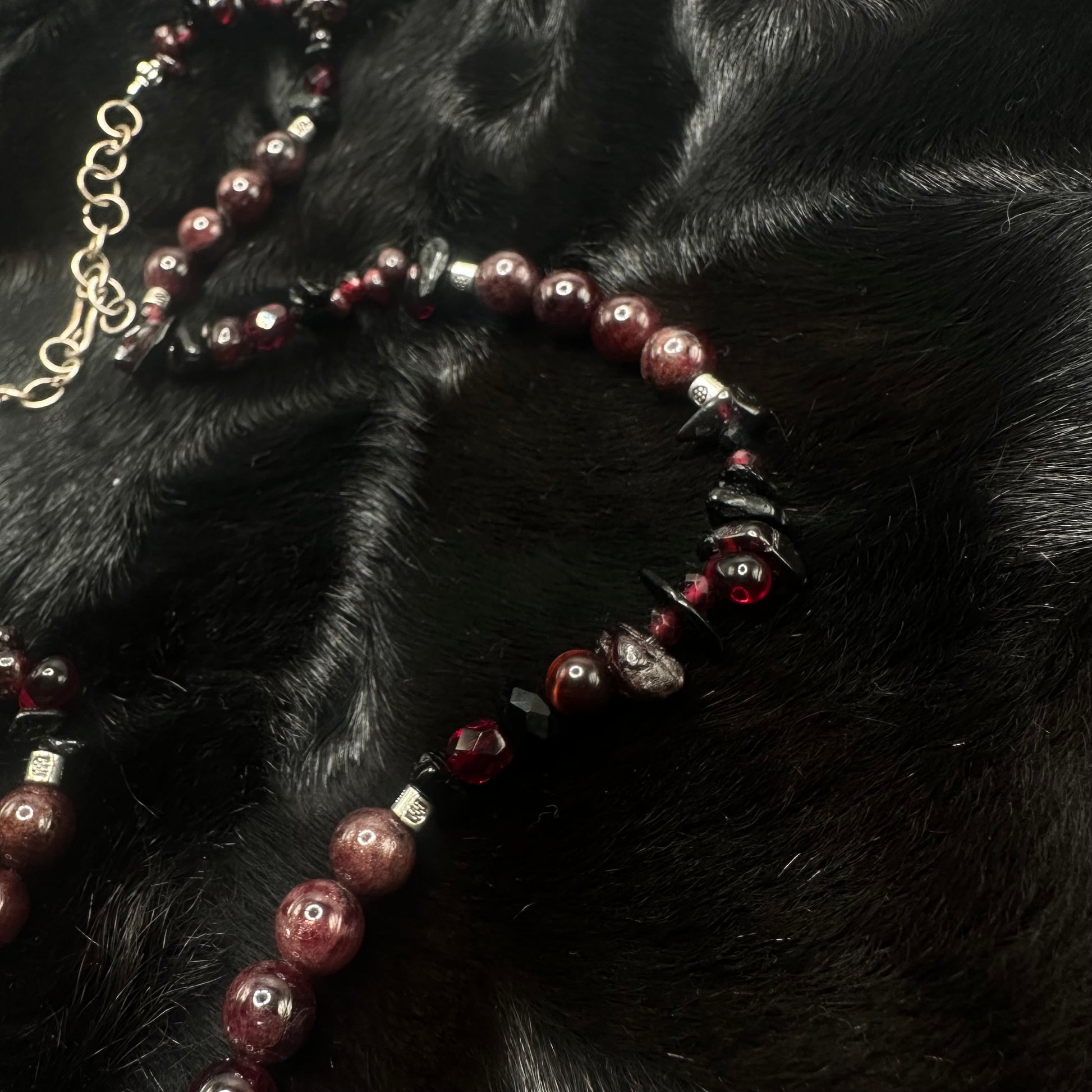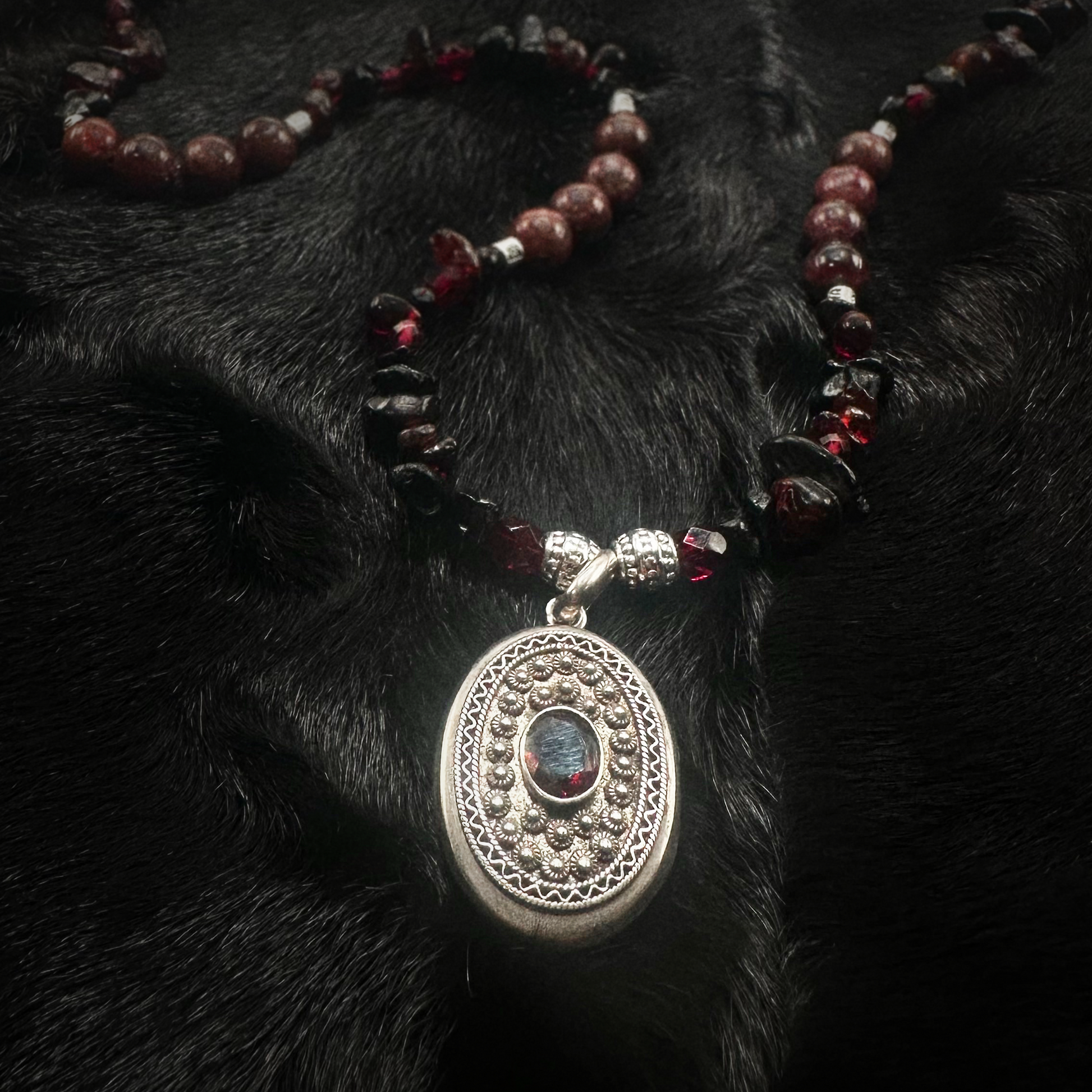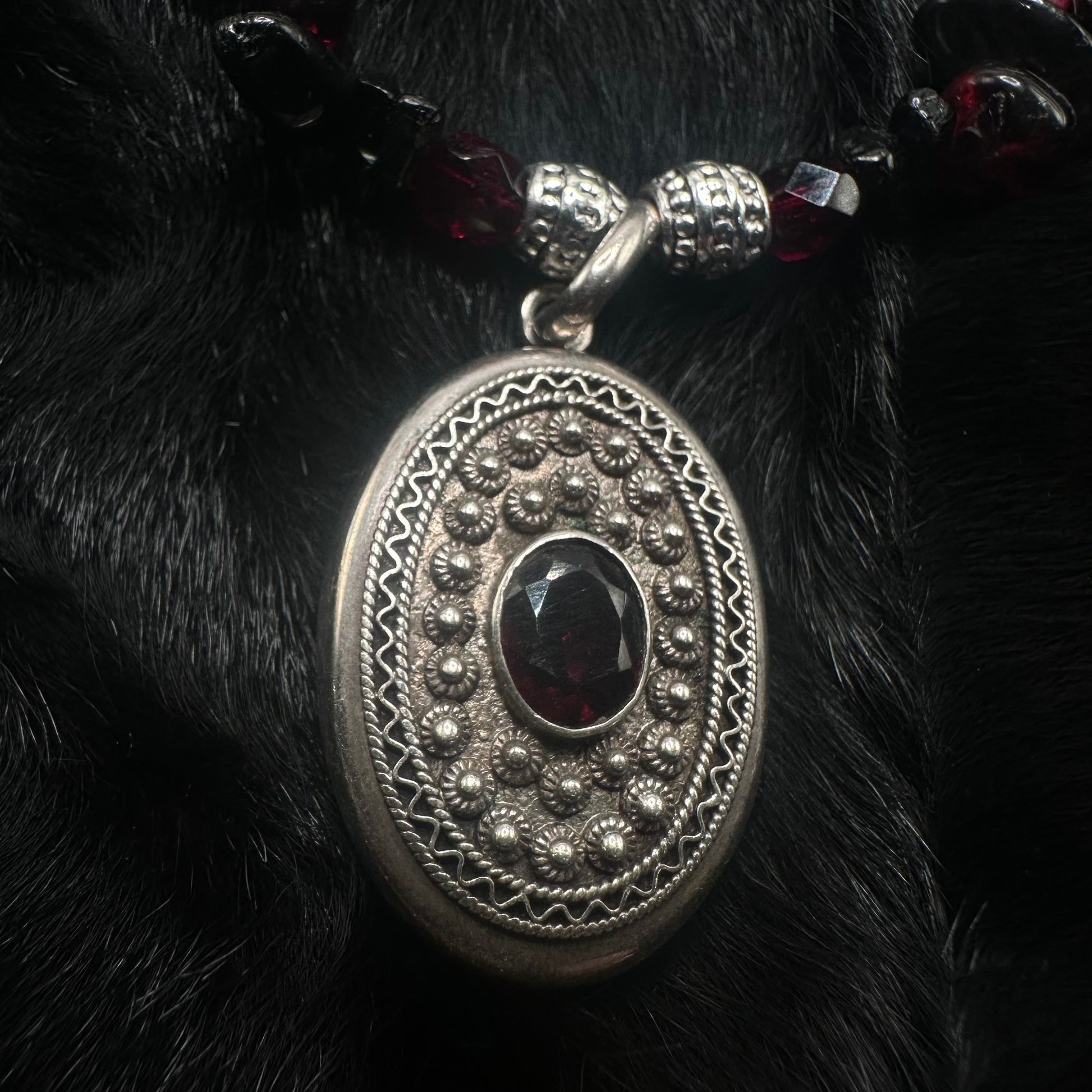 A wide variety of garnets and Czech glass strung on repurposed deep sea fishing line for maximum durability. The pendant is sterling silver with a purplish red garnet set in the middle. When the locket is opened, the garnet acts as a window.